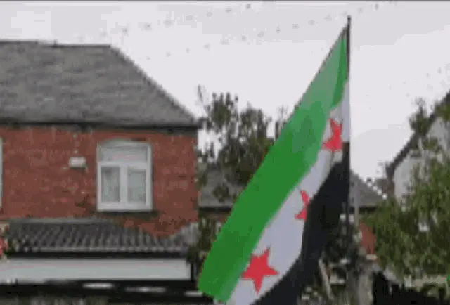 Animated display of the national emblem of Syria, featuring an eagle with a shield and three stars.