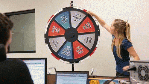 A woman spins a tech support wheel of fortune with common IT solutions like 'Tried Reboot?' and 'Cable Connect?'.
