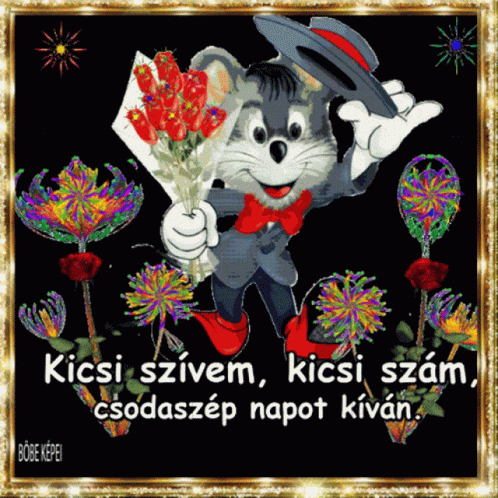 Animated cat in a suit holding a bouquet of red flowers, wishing a wonderful day with a heartfelt message.
