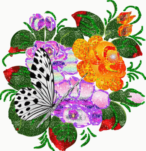 A black and white butterfly with spotted wings rests on a vibrant, glitter-covered bouquet of flowers.