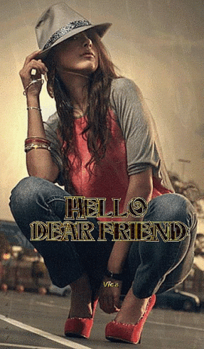 Stylish woman in a hat, jeans, and red heels squats, with 'HELLO DEAR FRIEND' text overlaid.