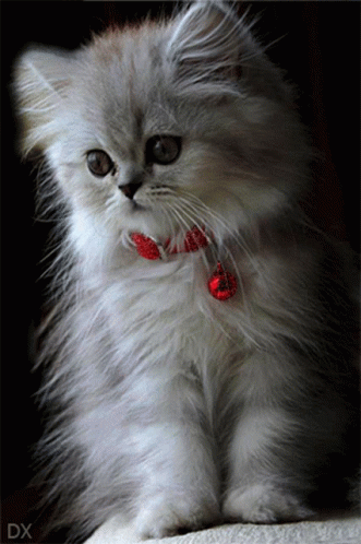 An adorable fluffy grey kitten with a red collar and bell sits, looking down in a charming pose.