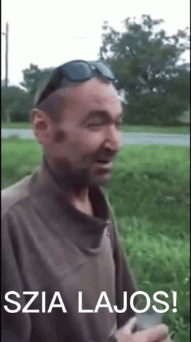 A man wearing sunglasses greets Lajos with 'Szia Lajos!' in a field.