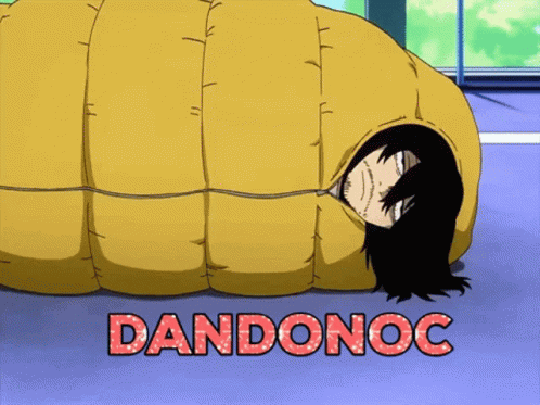 My Hero Academia's Aizawa (Eraserhead) in his iconic yellow sleeping bag, with 'Dandonoc' text visible.