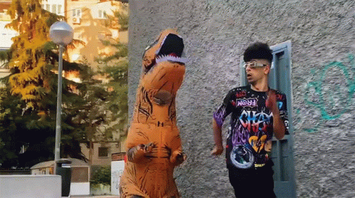 Bejo runs from a T-Rex in an urban setting, a playful and energetic chase captured in this fun interaction.
