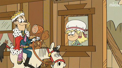 Lynn Loud Sr. in a king's costume on a horse presents something to Leni Loud from The Loud House.