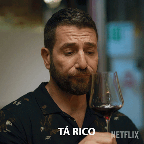 Raúl, from 'Machos Alfa', holds a glass of red wine, contemplating its richness with the phrase 'Tá Rico'.