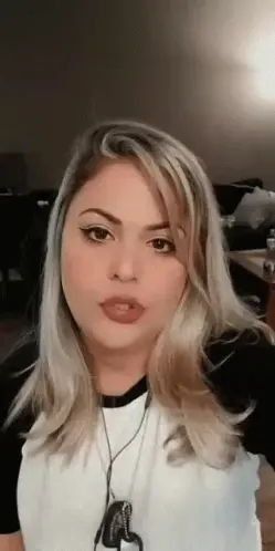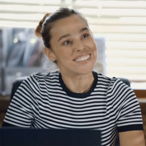 Thati Lopes smiling and reacting happily while wearing a black and white striped shirt.