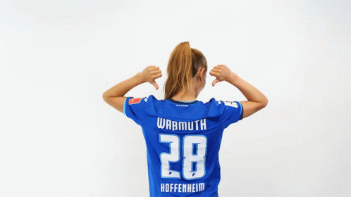 Tabea Waßmuth shows off her Hoffenheim #28 jersey, turning to face the camera.
