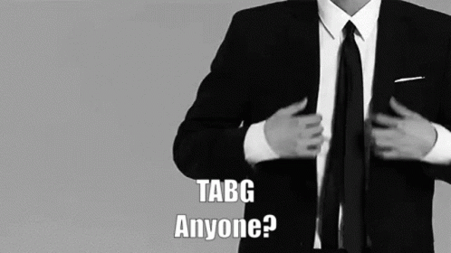 A man in a sharp suit and tie buttons his jacket, asking 'TABG Anyone?' in a fancy reveal.