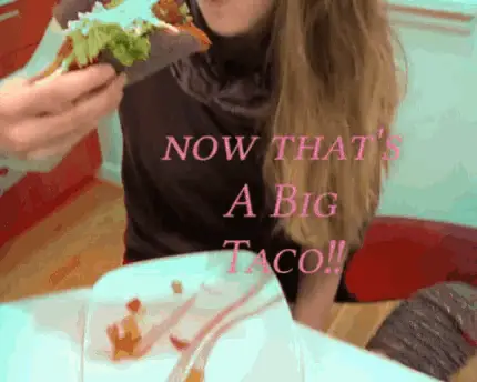A man in an orange shirt takes a bite of a Taco Bell taco and reacts with an expressive look.