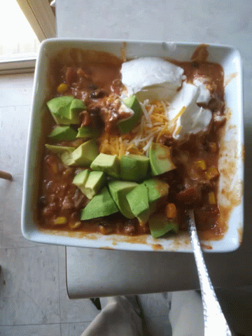 A hearty bowl of delicious taco soup, generously topped with fresh avocado, shredded cheese, and creamy sour cream.