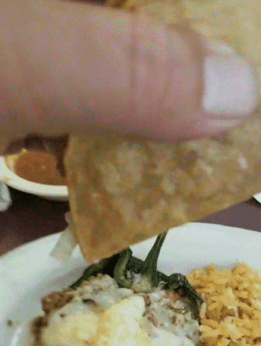 A hand dips a crispy tortilla chip into a cheesy chile relleno, pulling up a string of melted cheese.