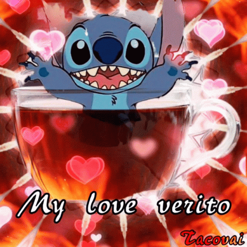 Stitch in a teacup surrounded by hearts, with the message 'My love verito' and 'Tacovai'.