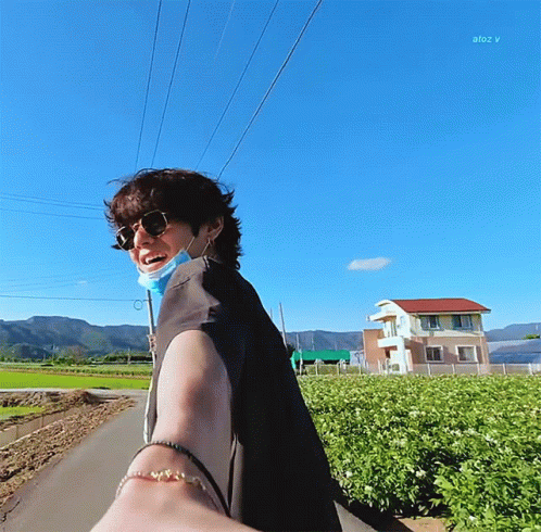 Kim Taehyung enjoys a sunny rural walk, holding hands with a companion, wearing sunglasses and a face mask.