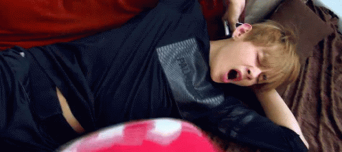 Kim Taehyung, also known as V from BTS, is seen lying on a bed, yawning and looking tired.