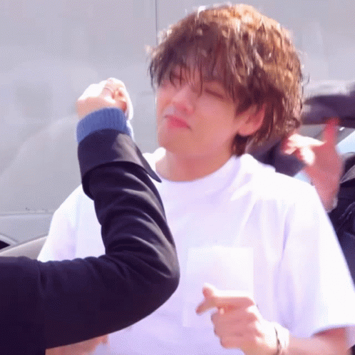 Taehyung (V from BTS) smiles and reacts with a happy expression, wearing a white t-shirt and messy brown hair.