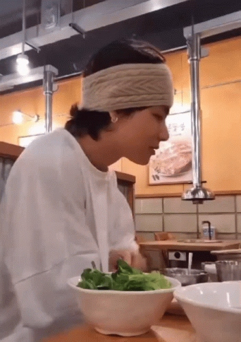 Taehyung from BTS, wearing a headband, enjoys a meal of salad with chopsticks at a restaurant.