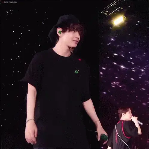 Close-up of BTS member V (Taehyung) on stage, wearing a sparkling jacket and microphone headset.