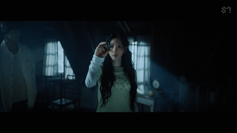 a woman in a dark room holds a small object in her hand