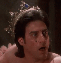 A man wearing a crown with a mole on his cheek, highlighted by a red circle, looks shocked.