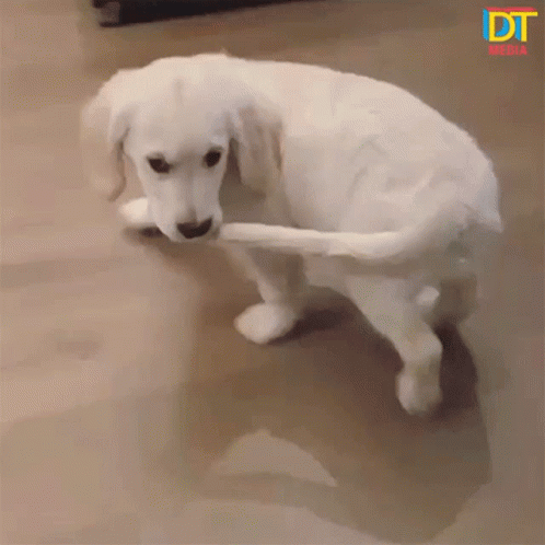 A cute white puppy playfully holds its tail in its mouth while standing on a light-colored floor.