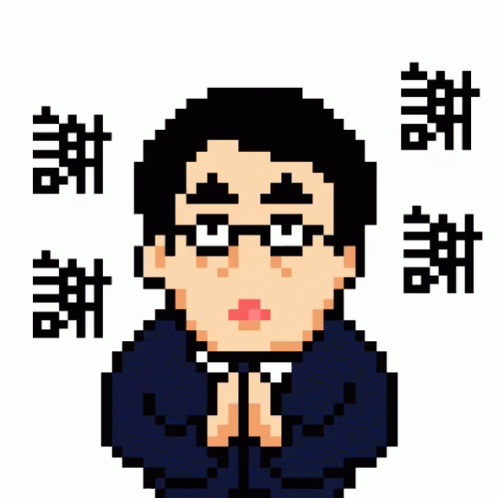 Pixel art drawing of a man with glasses, hands clasped, surrounded by 'Thank You' (謝謝) characters, from Taiwanweicher.