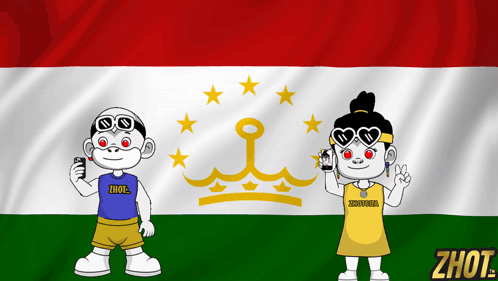 Animated boy and girl characters stand in front of a waving Tajikistan flag, featuring the 'Zhot' logo.
