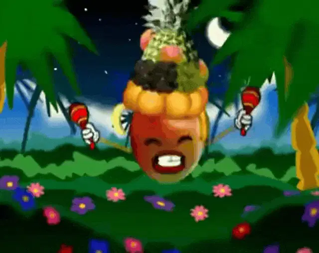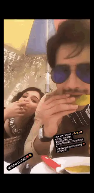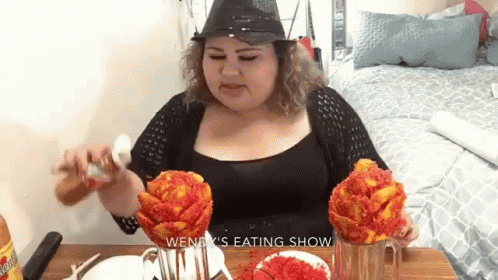 Woman preparing two large, flower-shaped mango and Hot Cheetos snacks, drizzling them with Tajin sauce.