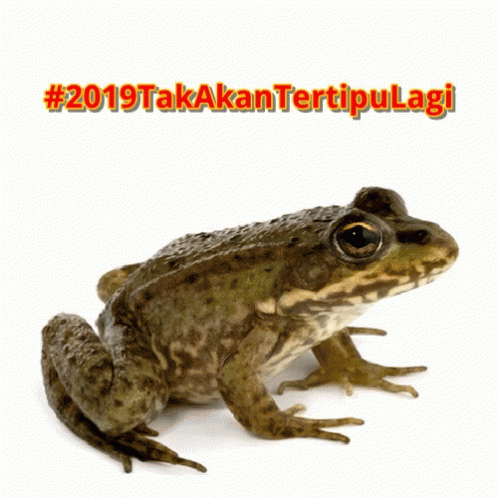 A frog on a white background with Indonesian text '#2019TakAkanTertipuLagi oleh #REZIM SONTOLOYO'.