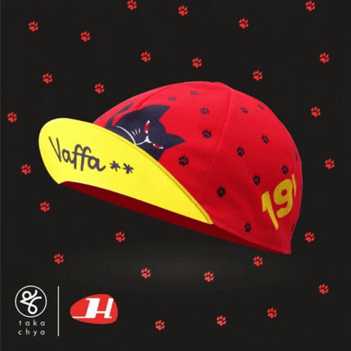A red and yellow Takachya Holimites cycling cap featuring a black cat design and "Mür dl Giat" text.