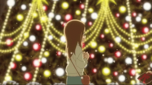 Nishikata gives Takagi a Christmas present in front of a beautifully lit tree.
