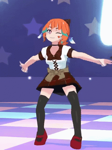 a cartoon girl with orange hair and blue eyes is dancing on a checkered floor