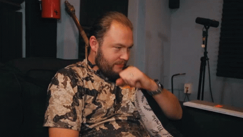 Sam Gorski from Corridor Crew takes a deep breath while sitting on a couch in a recording studio.