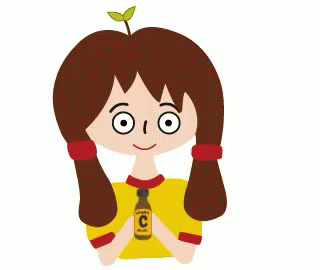 A cute cartoon girl with pigtails winks while holding a bottle of Vitamin C, promoting health.