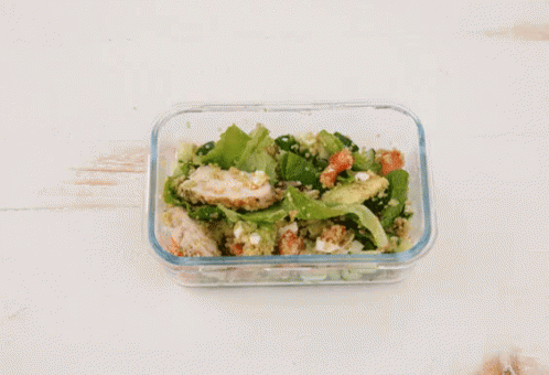 Preparing a healthy and delicious meal prep salad in a glass container for work.