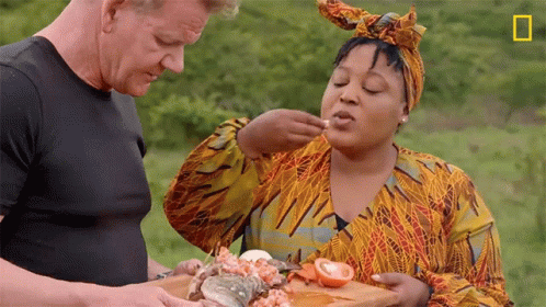 A woman in traditional attire takes a delicious bite of seafood from a wooden board, observed by Gordon Ramsay.