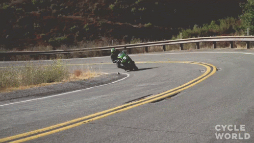 A green Kawasaki Z900RS motorcycle leans into a sharp turn on a winding road, showcasing high-speed cornering.