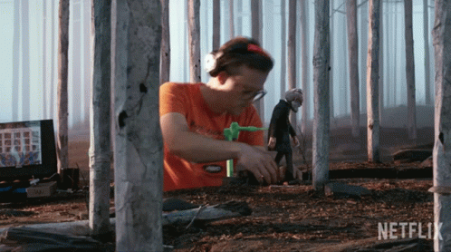 Behind the scenes of Guillermo Del Toro's Pinocchio, showing stop-motion animation of Pinocchio and Geppetto.