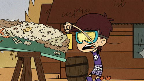 Luna Loud, wearing goggles and a skull shirt, attempts to clean muck but gets hit by the flying debris.