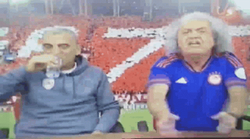 Greek sports commentator Takis Tsoukalas reacting with intense emotion during a football match, alongside another man.