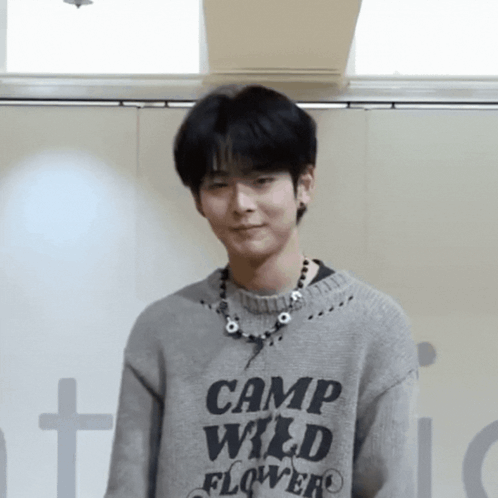 Takuma from LUN8 smiles charmingly, wearing a grey 'Camp Wild Flower' sweater and a black beaded necklace.