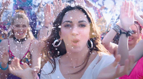 Kiara Advani blows a kiss amidst confetti, celebrating in a vibrant Bollywood party scene from Bhool Bhulaiyaa 2.