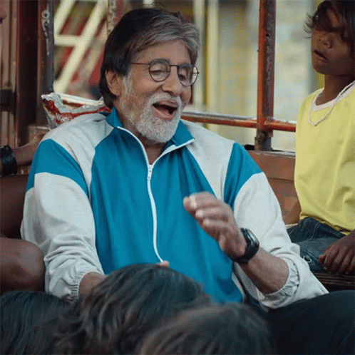 Amitabh Bachchan as Vijay Barse, clapping and smiling with children in a heartwarming scene from Jhund.