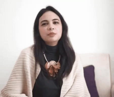 A young, pretty woman with long dark hair, wearing a cardigan and a distinctive necklace, speaking on a couch.