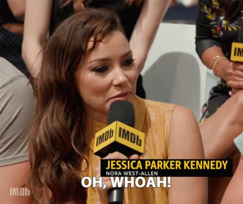 Jessica Kennedy Parker, as Nora West Allen, reacts with a surprised face while speaking into an IMDb microphone.