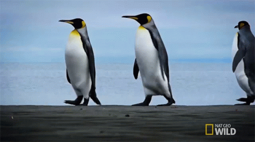 Three tall penguins walk along a beach, featured by Nat Geo Wild for World Penguin Day.