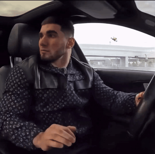 Tamaev, wearing a Louis Vuitton shirt, laughs joyfully while sitting in his car.