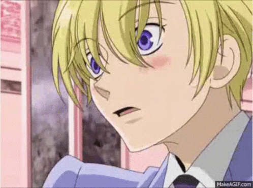 Tamaki Suoh from Ouran Host Club looking shy with a blush on his cheek, covering his face with his hand.
