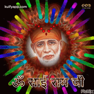 Devotional image of Sai Baba surrounded by vibrant lights, featuring the chant 'Om Sai Ram Ji'. Created by Nithya.